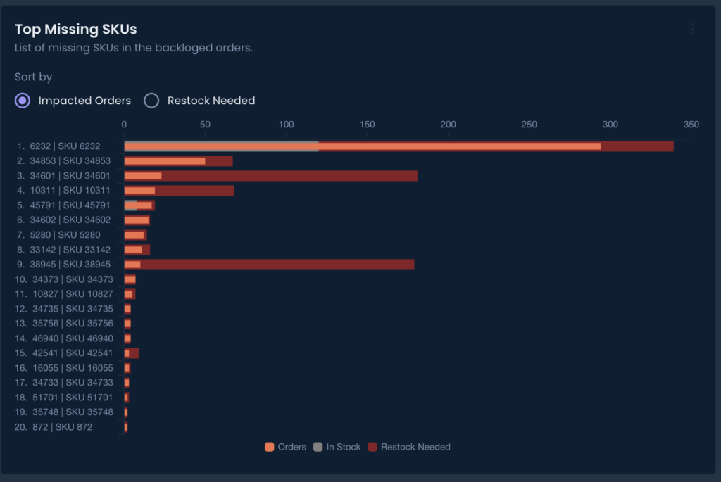 - Which SKUs are blocking orders? Top Missing SKUs highlights the products holding up the most orders and if they need replenishment.