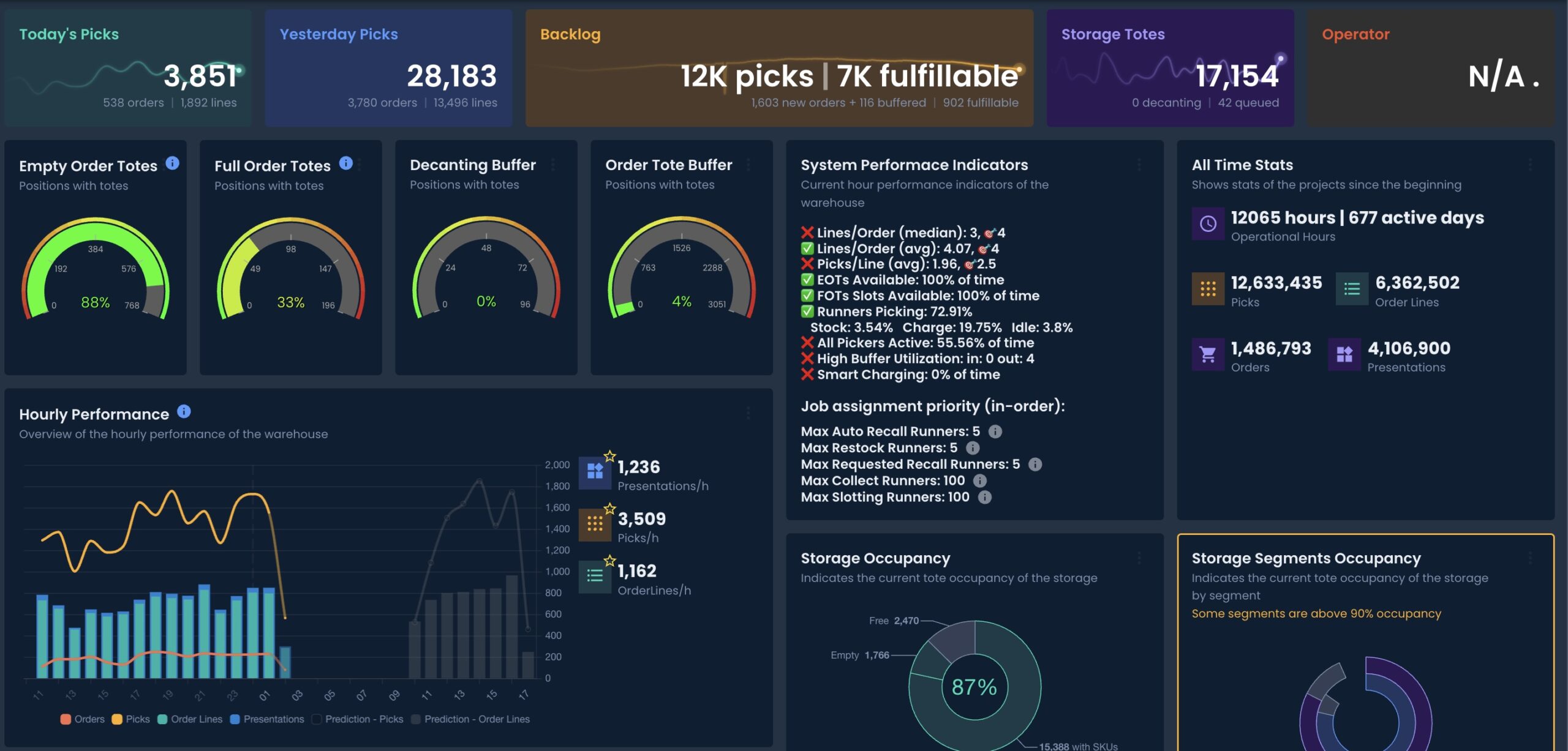 - Is flow being starved or backed up? Buffer and tote gauges (decanting, order tote buffer, empty and full storage totes) reveal where work is slowing down or piling up.